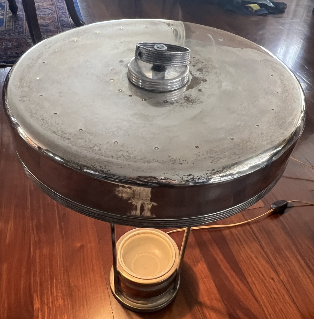 Lampara Art Decó de meta stainless redonda con base de baquelita. Funcionando. Tiene zafada la argolla de la parte de arriba. 8/10